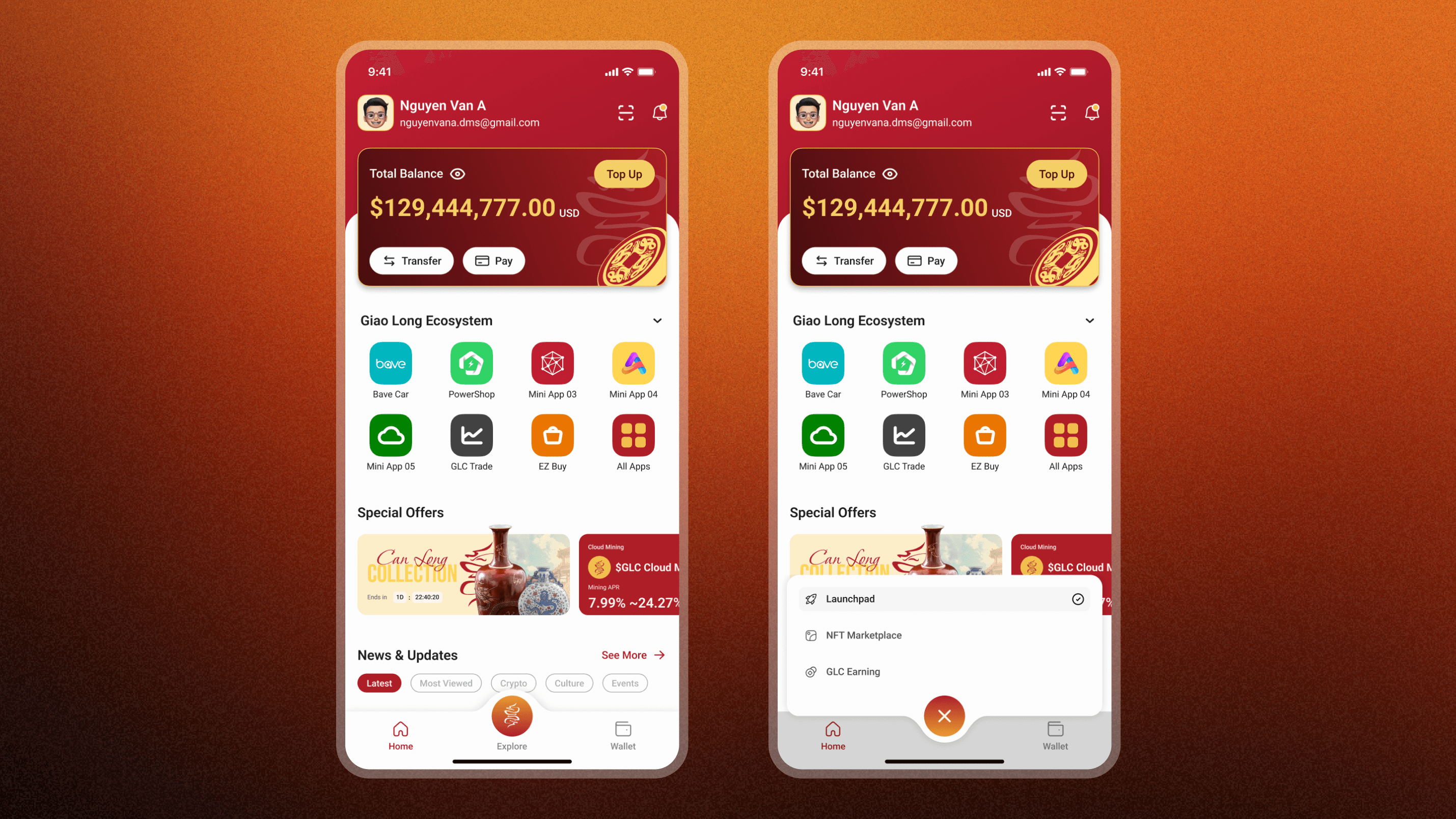 Scalable Grid System: I designed the Mini App Dashboard using a modular grid layout. This allows diverse services—from "GLC Trade" to lifestyle apps like "Bave Car" and "PowerShop"—to coexist on one screen, making the app future-proof as new features are added