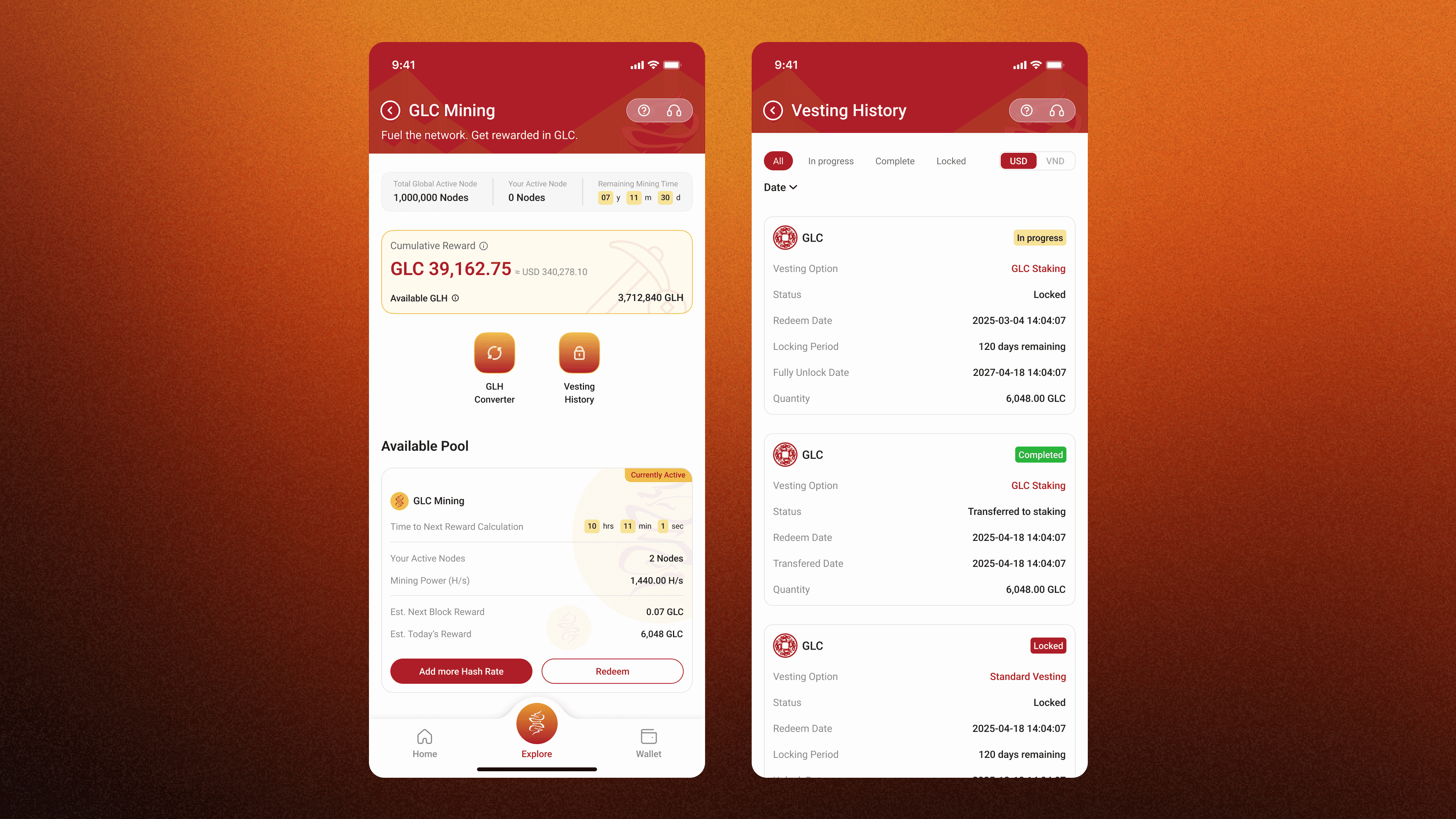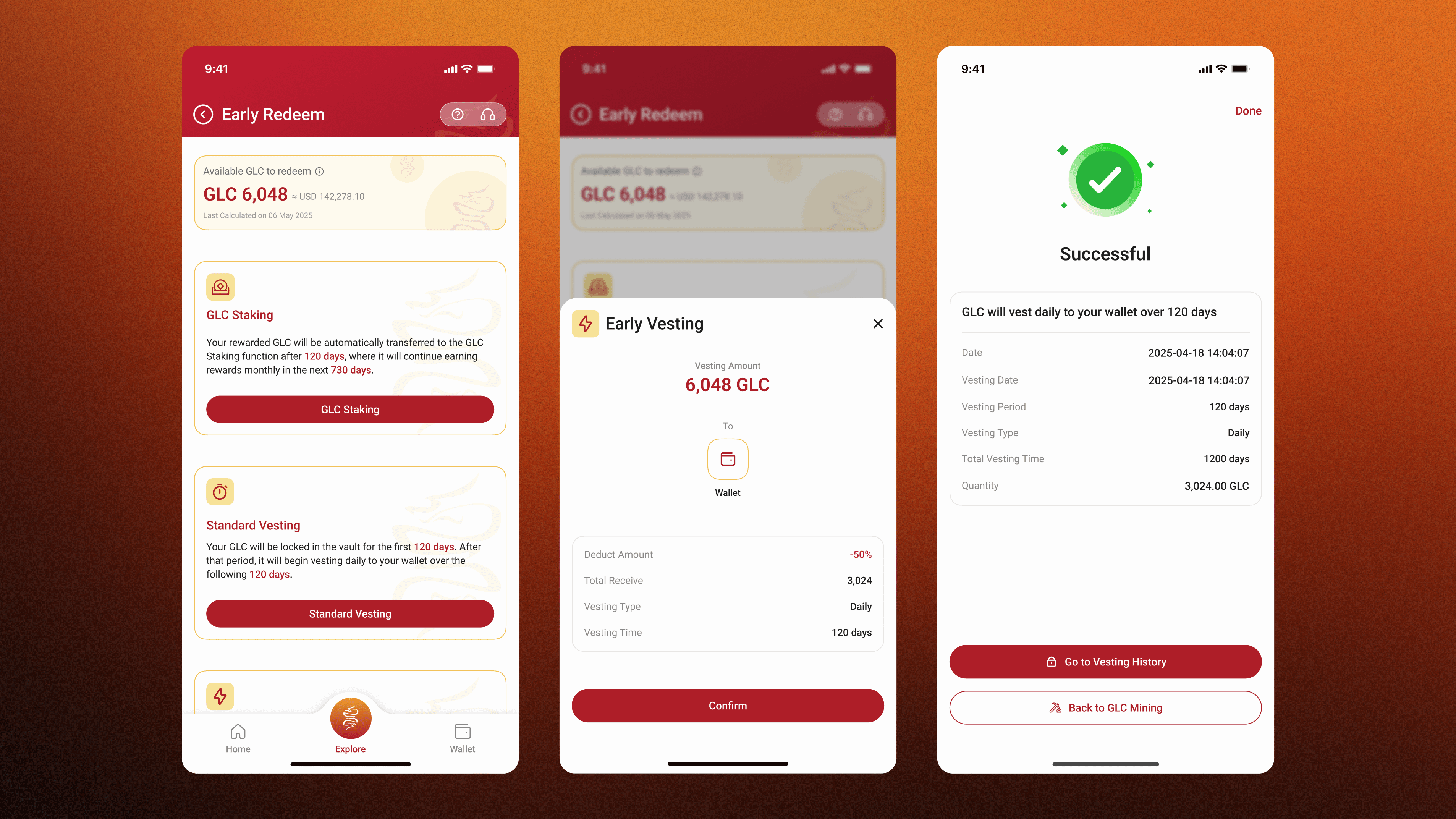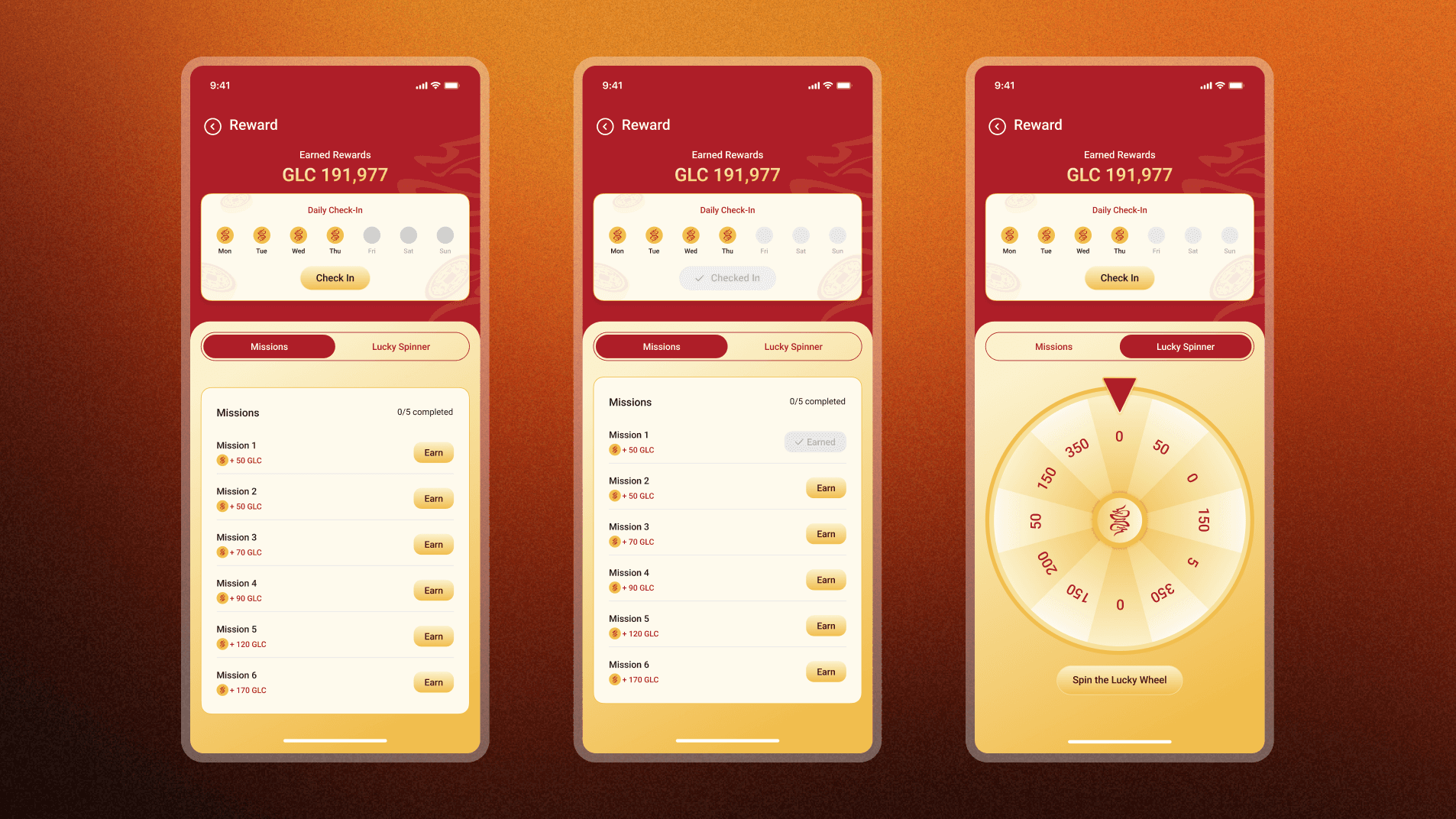 To drive daily engagement beyond standard trading, I integrated a "GameFi" reward system directly into the user's routine. By designing a visual Daily Check-in tracker and an interactive Lucky Spinner, I transformed passive app opens into habit-forming micro-interactions. The Mission List offers clear, bite-sized goals (e.g., "Mission 1: +50 GLC"), giving users a constant sense of progression and immediate gratification that keeps retention rates high.