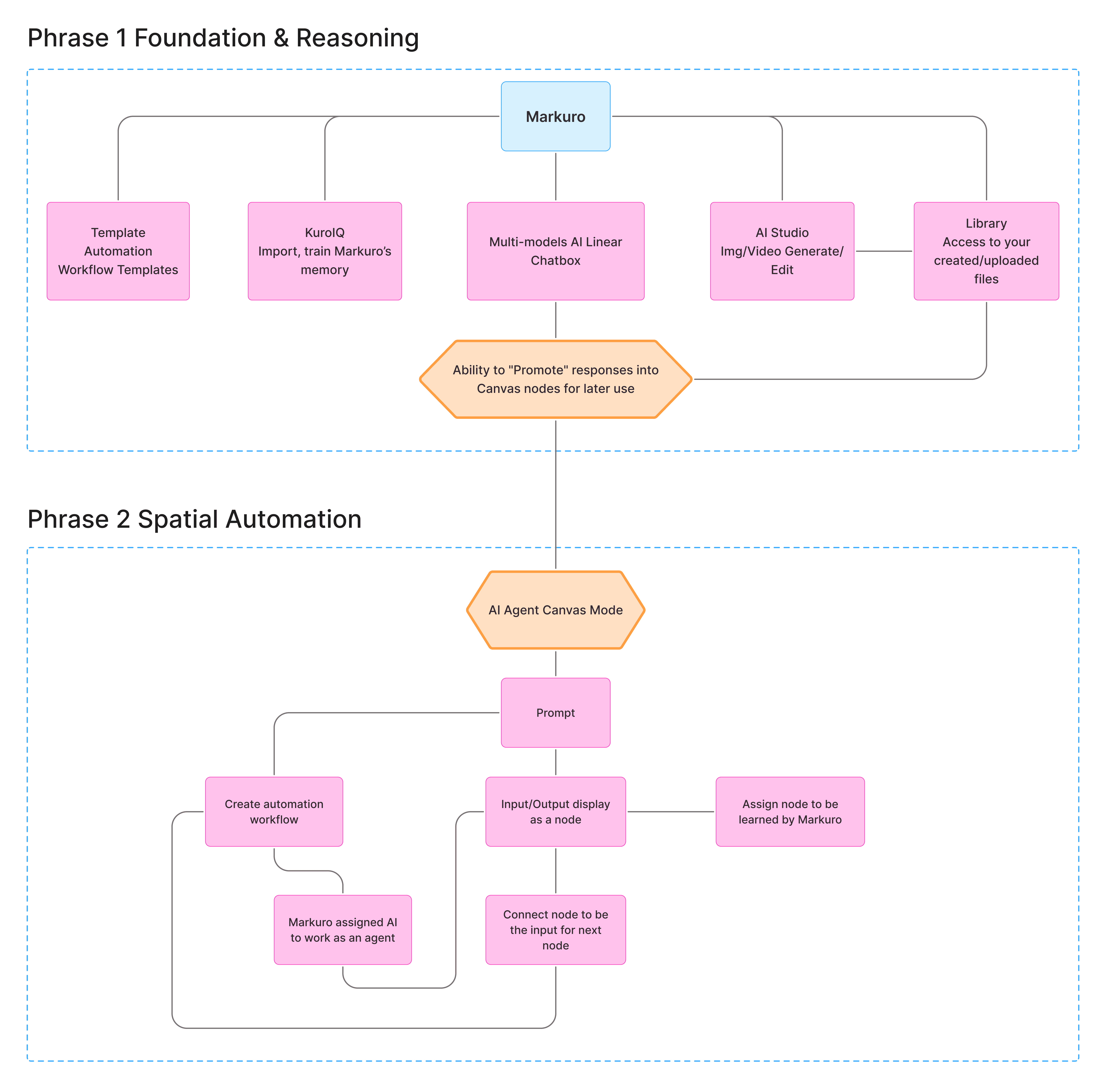 My initial vision for Markuro was to replace fragmented chat tabs with a Visual Node Canvas. This allows users to "wire" different AI models together to create Autonomous Agents that handle entire workflows—from deep research and content creation to automatic social media posting—all within a single, unified interface.