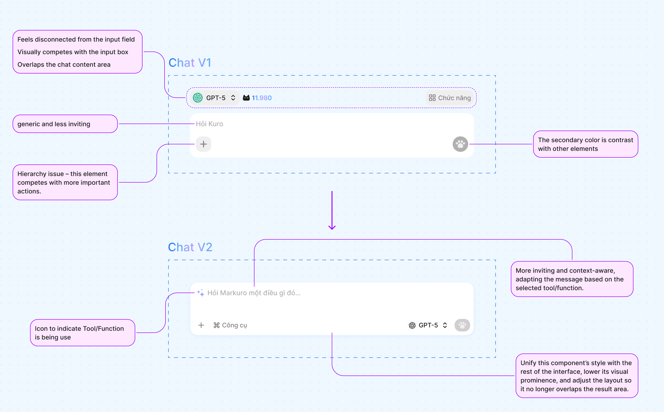 Under the influence of ChatGPT, Claude, and Gemini, the linear Chat Interface remains the gold standard for user comfort. To reduce the learning curve and accelerate our Time-to-Market (TTM), we shifted our initial focus to a refined Chat-first experience. This allows us to: